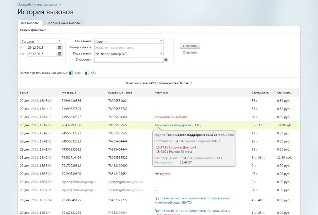 - С помощью фильтров можно проанализировать информацию по отдельным номерам, сотрудникам, участникам разговоров, номерам клиентов.