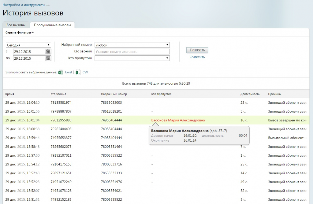 - Подробный анализ пропущенных звонков, с указанием конкретных причин пропуска или ответственного за пропуск сотрудника.