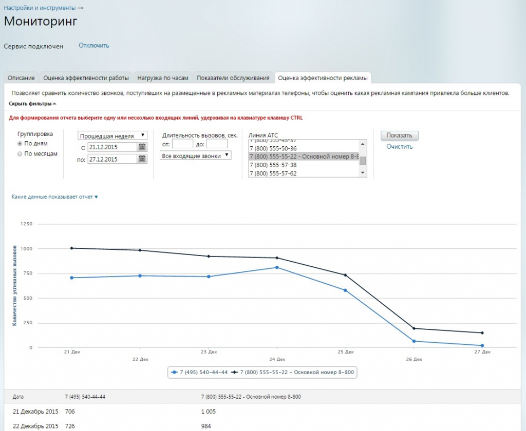 - С помощью маски можно настроить фильтры по отдельным направлениям, например, указав в поле «Номер клиента» значение «495» вы увидите историю звонков из Москвы.