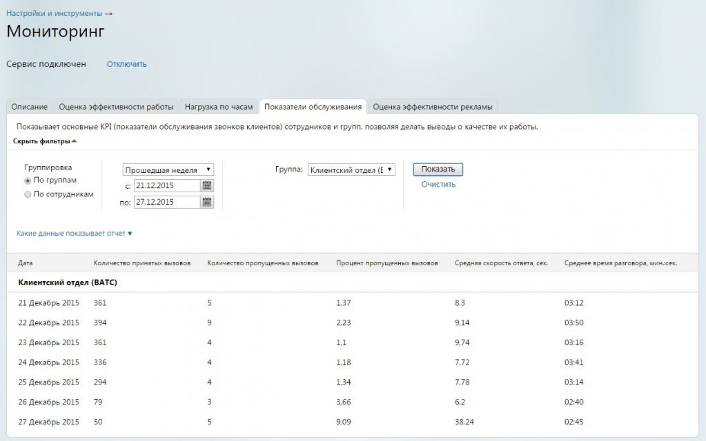 - среднюю длительность разговора в целом, по подразделениям компании или определенным сотрудникам.